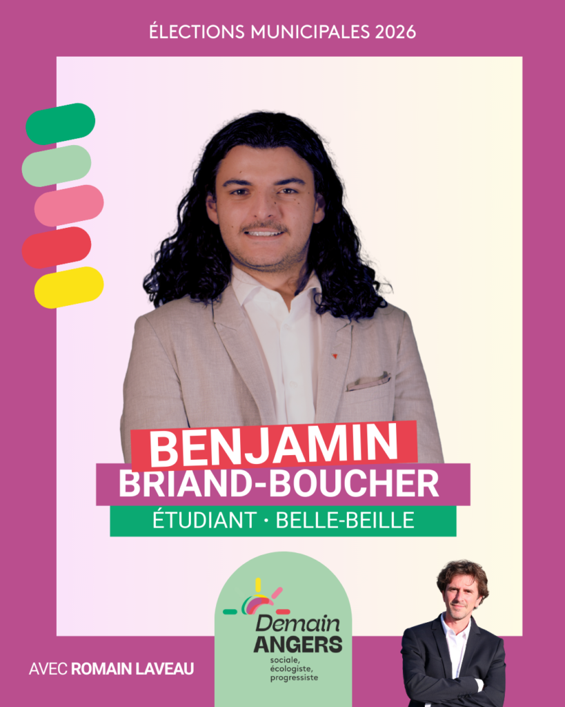 Je suis né et j’ai grandi à Angers. En voyant, au fil des années, le délitement des services publics de proximité, la hausse des tarifs de certains services municipaux et la place de plus en plus réduite donnée à la parole des habitants, j’ai décidé de m’engager pour que l’on entende davantage celles et ceux qu’on met trop souvent de côté — en particulier les jeunes et les plus précaires.