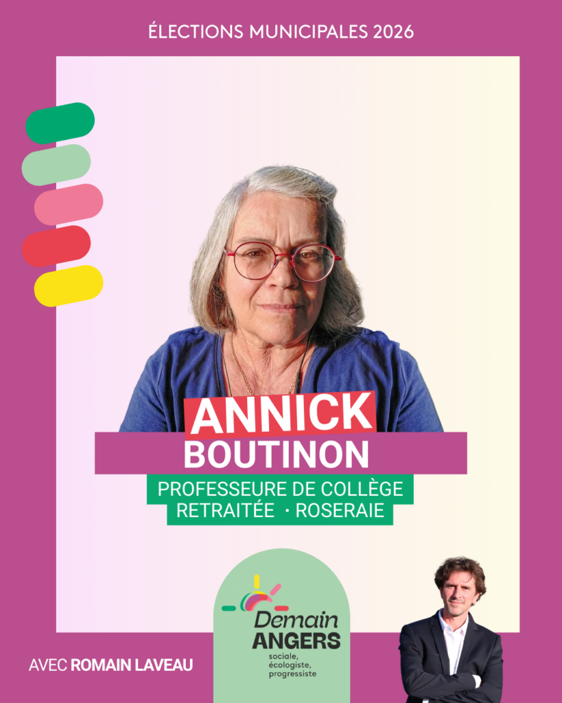Après avoir beaucoup bougé en France au cours de ma vie, et devenue retraitée de l’enseignement secondaire, j’ai rencontré à Angers de nombreuses personnes adorables. Je souhaite soutenir tout·e·s celles et ceux qui veulent bâtir une ville et un territoire où les valeurs de solidarité, de féminisme, de partage et de respect du vivant sont bien vivantes et solides.