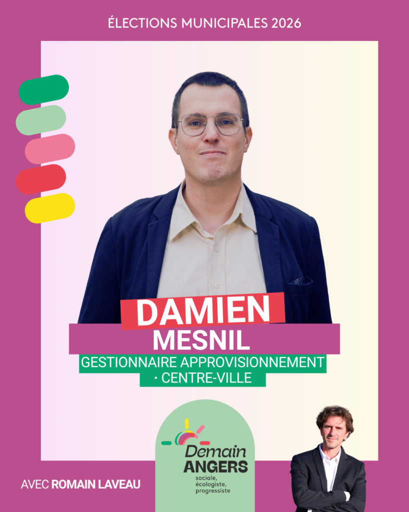 Je suis Damien Mesnil, âgé de 32 ans, membre actif d’une association et engagé dans le milieu LGBTIQIA+ angevin. Je travaille dans le secteur privé et je vis avec un salaire au SMIC. Je suis donc directement concerné par la baisse du pouvoir d’achat que ressentent de nombreux citoyens.