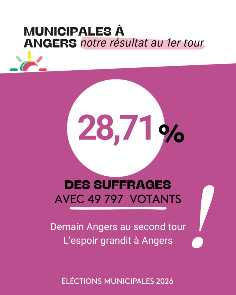 Ce résultat démontre qu’une dynamique est là. Nous avons montré aux Angevins et aux Angevines que nous étions l’alternative pour qu’Angers soit une ville plus écologique et sociale. Au second tour, rien n’est joué : nous allons continuer à rassembler et à porter notre projet dans toute la ville.