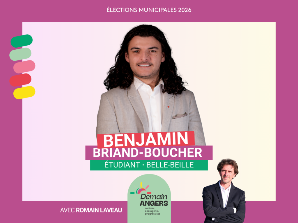 Je suis né et j’ai grandi à Angers. En voyant, au fil des années, le délitement des services publics de proximité, la hausse des tarifs de certains services municipaux et la place de plus en plus réduite donnée à la parole des habitants, j’ai décidé de m’engager pour que l’on entende davantage celles et ceux qu’on met trop souvent de côté — en particulier les jeunes et les plus précaires.