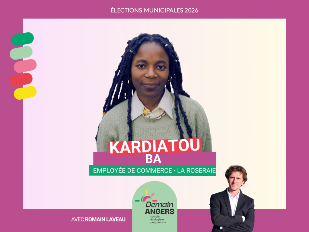 Je m’appelle Kardiatou Ba, j’ai 26 ans et je suis candidate sur la liste Demain Angers. Issue de la société civile et employée dans le commerce, je m’engage aux côtés de Romain Laveau pour porter les enjeux de mobilité accessible, de justice sociale et d’amélioration du quotidien des Angevins, notamment dans les quartiers du centre-ville, Saint-Serge, place Ney et Chalouère, en proposant des actions concrètes sur les transports publics et la tarification solidaire.